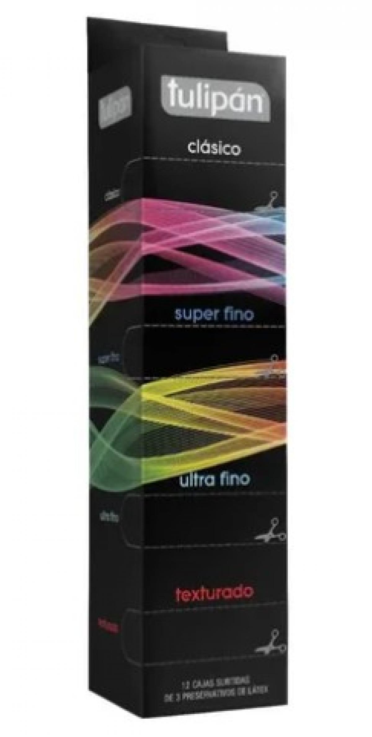 1 caja de preservativos Tulipán en dispenser tubo de 12 cajitas x 3 unidades cada una. En total son 36 preservativos.