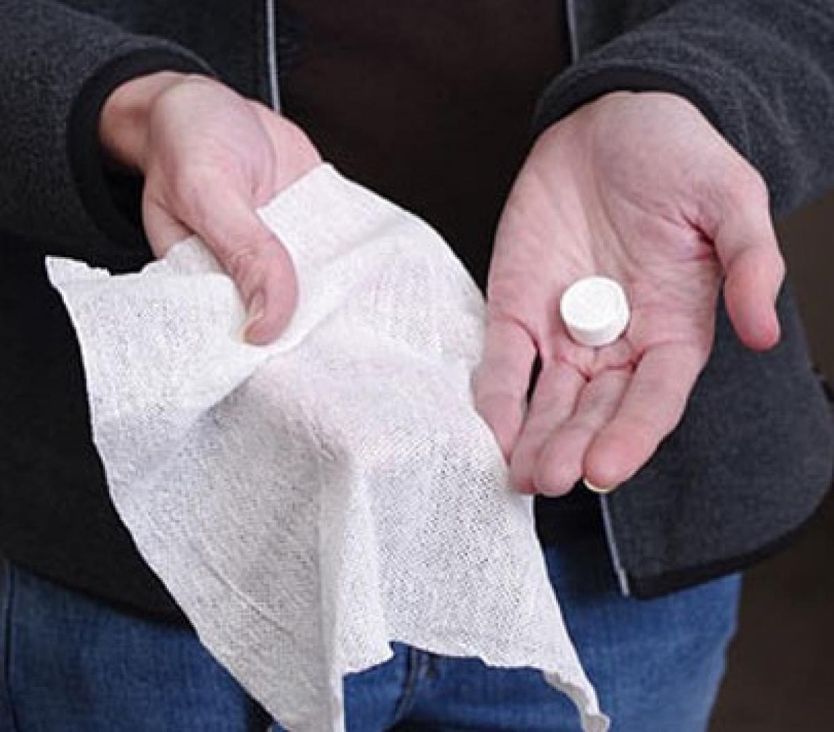 SE HUMEDECE LA TOALLITA, SE EXPANDE, LUEGO SE COMIENZA A DESENROLLAR, Y QUEDA LISTA PARA SU USO.